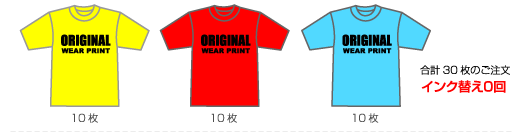 30枚ご注文の場合で10枚づつプリントカラーを替える場合はインク替え作業が2回となります。